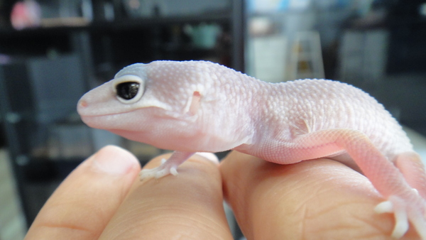 ちょっと変わったブリザードのベビーです。どこが変わってるのかというと、目がマーブルアイみたいになっています。画像では分かりにくいのですが、普通のマーブルアイほどではないですが目がキラキラしています。これも国内ブリードの個体になりますが、片方の親がこういうマーブルアイみたいなブリザードで、ブリーダーさん曰くマーブルアイとかエクリプスの遺伝が優勢遺伝するのかわからないけど、このベビーの兄弟はみんなこの目をしてるので、もう片方の親がヘテロというわけでは無さそうとのことです。なのでこのベビーを使ってブリーディングすれば産まれてくるベビーには全てこの目の変異が遺伝する可能性もありますね。ちょっと気になるところですので、どなたかぜひ繁殖にチャレンジして検証して下さい!!左下の画像です。