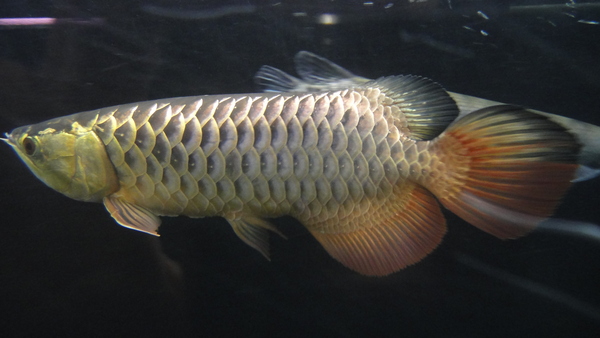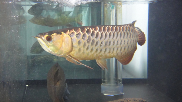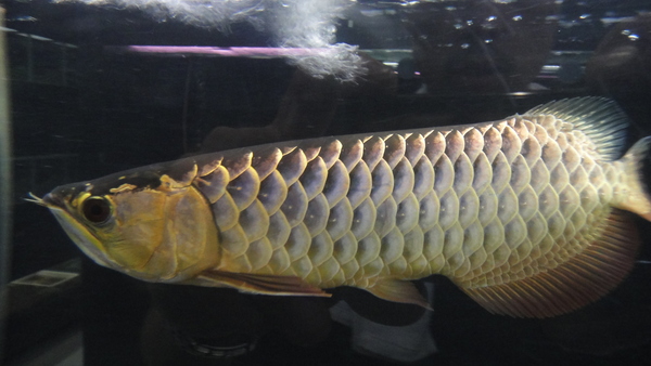 シャンロンアクアティック産のジョホールゴールデンです!下取り個体につき超大特価!金の発色も濃く、鱗底は濃い藍色です!金のあがりは6列目の端が少し光ってる程度ですが、まだ2才半位の若い個体なのでこれからまだまだ金の発色はあがっていくと思います!目垂れ、アゴずれ、エラ捲れはありませんが、前に左の胸ビレが折れてしまったことがあるらしく、まだ少しだけ左の方が短いですが、先までピンとキレイに生えてきています!なのでもうしばらく飼い込んであげれば完全に伸びきると思います!現状でもほとんど分からないくらいに再生していますので、全然気にならないとは思います!スプーンヘッドのハイボディというような今時な感じの個体ではありませんが、濃い金質と胴長な体型が逆に新鮮で、クラシカルな雰囲気からオールドマニアの方に特にオススメです!とてもキレイな個体なので混泳させるのがもったいないくらいですが、店頭では淡水エイやガー、パーチの大きいのと混泳させており、どうも性格は大人しいようなので混泳向きかもしれませんね!?画像は全て同一個体です。左の胸ビレも全然気にならないでしょ!?
