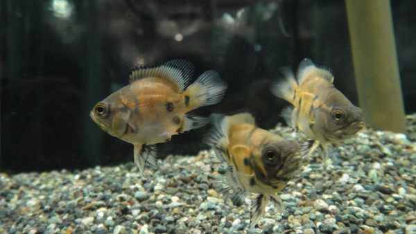 まん丸でビー玉みたいなオスカーです。ショートのタイガーということで入荷してますが、確かに少し黒いバンドというかラインのような模様は入っていますが、見た感じはほとんどレッドオスカーですね。こんなに丸くてかわいければ色なんてどっちでもいいですけどね!中段右の画像です。