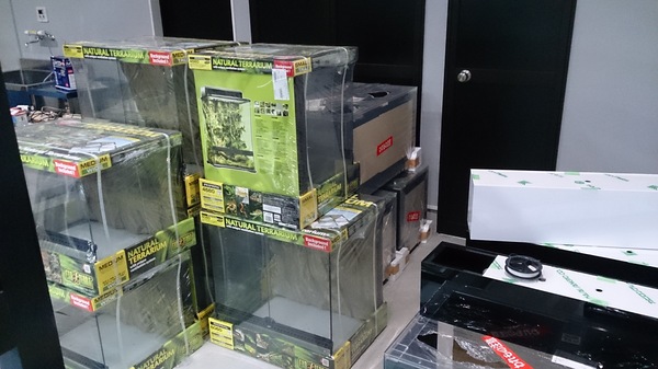 引っ越し大変です!まだ全然終わっていませんが、もう2度としたくないです!水槽の台を移設しながら水槽や魚を移動しているんですが、水槽の台がかなり頑丈なのですごく重たいんです!新店舗の工事をお願いした業者さんに台の移設もお願いしてあるのですが、思っていたよりもはるかに重たいらしくなかなかはかどりません・・・。そんな中とりあえず小さい魚は少し移動させました!あと2400と1500の水槽を設置しました。オーバーフローの配管はほぼ終わりましたが、配管の部品でちょっと足りないのがあったので水を入れるのはもう2~3日後かな・・・?配管が完全に済んだら台に化粧パネルを取り付けます。まだ梱包されたままの新品の水槽だってそのまま放置で、いろいろとやることが山積みです・・・。気が遠くなりそうです・・・。