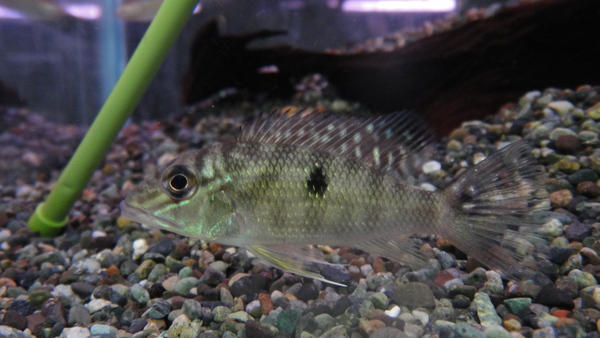 胸ビレの長いバットマン体型でヒゲモジャのオス確定個体です!真っ黒の体に水色のスポットがすごくキレイですね!