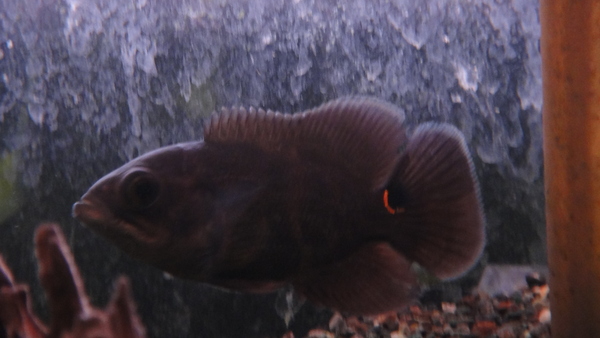 アラグアイア産のワイルドオスカーです。”マーブルオスカー アラグアイア”のインボイスで入荷しましたが、目立ったマーブル模様はなく現状ではかなり地味な個体です。でもこのサイズでここまで模様がはっきりしない個体は逆に面白いかも??尾筒のスポットを囲むオレンジのリングも何故か中途半端に途切れていたりして面白い個体です!中段右の画像です。