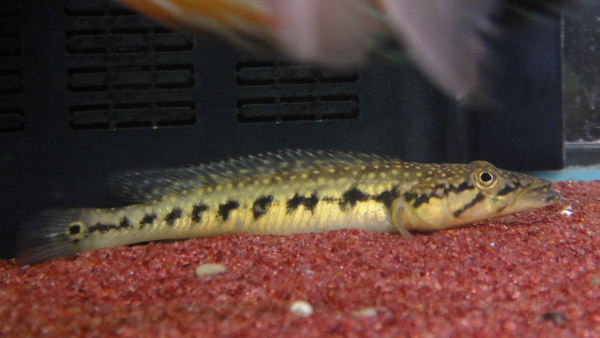 あまり入荷しないちょっと珍しいハゼ型のパイクシクリッドです。体色はほぼ黒で地味ですが、逆にそこがシブくてかっこいいんです!これも人工飼料にも餌付きやすく、他の魚とは比較的混泳もさせやすいので飼い易くてオススメのパイクシクリッドです。中段右の画像です。画像でも分かる通り、白点病になってしまいました・・・。なので販売は白点病が治ってからになります。