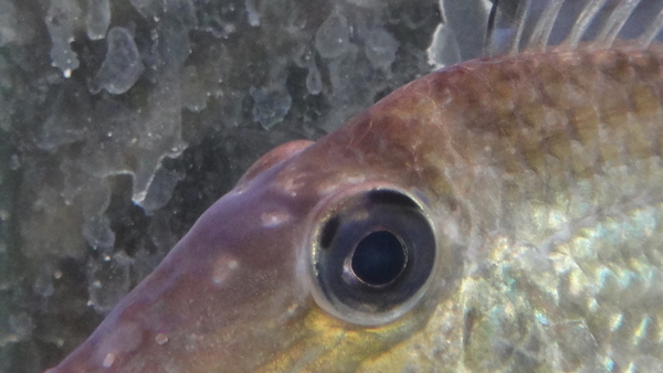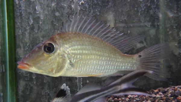 細かいホワイトスポットがキレイなハゼ型のパイクシクリッドです。見た目はイカツいですがパイクシクリッドの仲間の中では混泳もさせやすい方ですし、人工飼料にも餌付きやすいのでとっても飼い易いです!中段左の画像です。