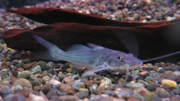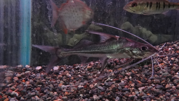 上記のバルバードに混じって1匹だけ輸入された謎のナマズです。片方の胸ビレが欠けて少し小さくなってしまっていたので安くしてもらいました。でもちゃんと生えてきていますので完全に再生するのも時間の問題だと思います。詳細は分かりませんが、口が少し下を向いていてベルギアリア属のナマズに似てます。でもベルギアリアはパラナ水系産でペルーにはいないはずなので、ベルギアリアではないはず・・・。体はシルバーでややロングボディ、顔は短めで口はやや下向きです。良く分かりませんがスーパーマニアの方、こんなナマズいかがですか??右上の画像です。