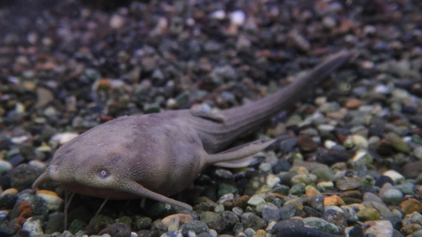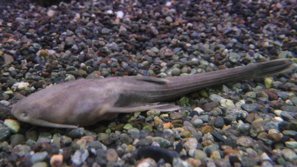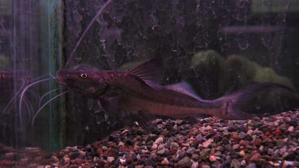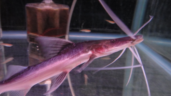 これはいいですね!ペルー便での入荷だからペルーサーベルが来ると思ってたんですが、いつもの(と言っても滅多に入荷しない魚ですが)ペルーサーベルとはなんか違うような気がします!?もしかしてこれがマニアの間で普通のサーベルバンジョーとか本物のサーベルバンジョーとかって呼ばれてるやつなんでしょうか?目はほとんど退化しているようです。それと他のバンジョーキャットの仲間とは比べものにならない位に口が大きいです。この魚は当店では初入荷かもしれません!?今回のはすごく大きくて立派ですよ!14cmもあるサーベルバンジョーなんて初めて見ました!!体色もペルーサーベルバンジョーにありがちな真っ黒のボディに背中に明色のラインが入るパターンではなく、全身が青っぽい薄い灰色です。キレイで大きいサーベルバンジョーですのでマニアの方はお見逃しなく!1匹のみです!中段右と左下の画像です。2つの画像は同一個体です。