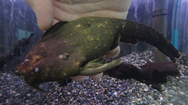 今シーズ2回目!貴重なピラムターバが1匹だけですが再入荷です!でもちょっと状態がイマイチなのでしばらくトリートメントが必要ですね・・・。たとえ状態がイマイチでも貴重なナマズなので仕入れないではいられませんでした!がんばってトリートメントして状態を立ち上げますよ!!でも実はまだ前回入荷分が1匹だけ残っています!そっちはもう12cm位あってメダカをバクバク食べて絶好調ですからね!大きいのも小さいのも値段は一緒ですので、ピラムターバをお探しの方はこっちの大きい方をどうぞ!左上の画像です。画像の個体は前から在庫している大きい方の個体です。