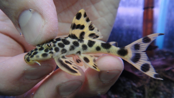 これ大好き!!黄色っぽい地色に大柄な黒いスポットがヒョウ柄みたいですごくキレイです!スマートな体型と精悍な顔つきもグッドです!タイガープレコの名前がついてますが、この魚結構大きくなります!昔は30cm近い個体が輸入されることもあったんですけど、最近は小さいのしか来ませんね・・・。中段左の画像です。