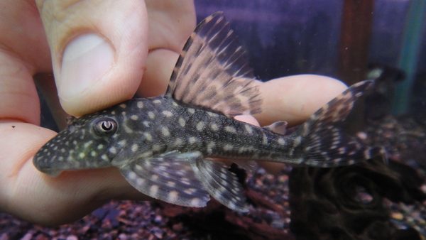 パンタナル産の元祖タイプのアンジェリカスプレコです。白っぽい薄茶色のはっきりしたスポットが入る、背ビレの大きなとてもかっこいいプレコです。大きいサイズで輸入されることがほとんどなので結構高価な種類なのですが、今回はかなり小さめの個体が入荷しました!それでもそこそこの値段はしますね・・・。でも珍しくてキレイなプレコなのでオススメです!コケも食べてくれますよ!
