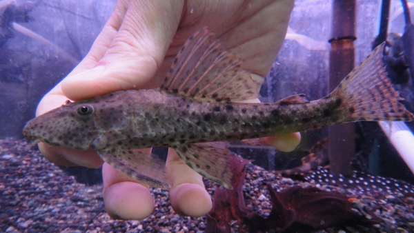 激レアヒポストムス入荷!頭が丸くて、何となくアーマードプレコみたいなシルエットのとっても変わったヒポストムスです!体表もサタンプレコのようなゴツゴツ感があってカッコいいです!ちょっと地味で渋いプレコですが、滅多に入荷しない珍しいプレコなのでオススメです!ヒポなんでコケ掃除にもいいですよ!中段右の画像です。