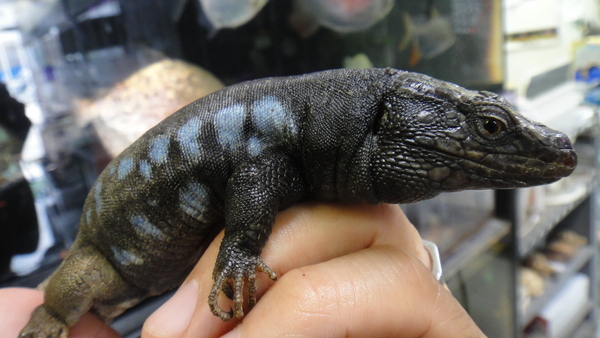 青い班が発色したキレイなオス個体ですが、残念なことに再生尾ですが状態は絶好調でよく太っています!丈夫で飼育しやすい良いトカゲですよ!