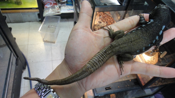 全長で20cm以上あるのでなかなかの見応えです!見た目はとってもキレイですが凶暴で噛む力も強いので、トカゲの扱いに慣れた方にオススメします。ビギナーの方が安くてキレイだからといって安易に飼うと後で後悔するかも・・・!?