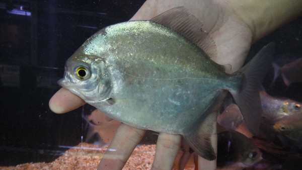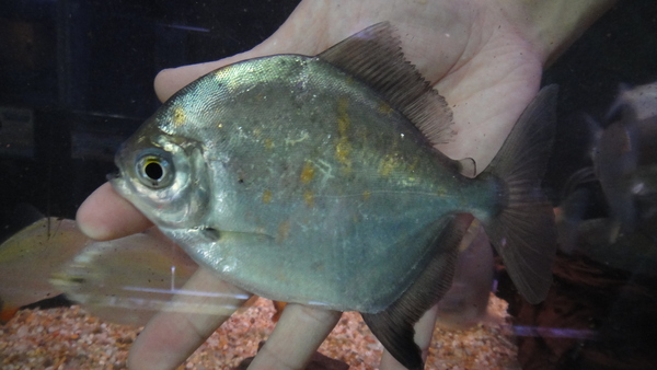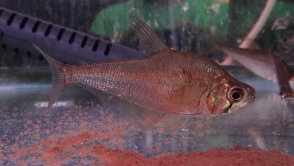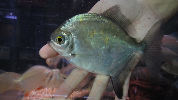 1~2か月前にイエローフィンカラックスのインボイスで入荷したカメタ産のカラックスがいましたが、多分それと同じやつの小さい個体だと思います。まだ前回入荷した大きい個体ほどヒレの色ははっきりしていませんが、それでもうっすら黄色っぽいようなオレンジ色っぽいような感じはしますので、成長につれてヒレの色も鮮やかになってくれると思います!今回はサイズが小さい分前回のよりだいぶお買い得です!南米牙カラシンのマニアの方はお見逃しなく!!左下の画像です。