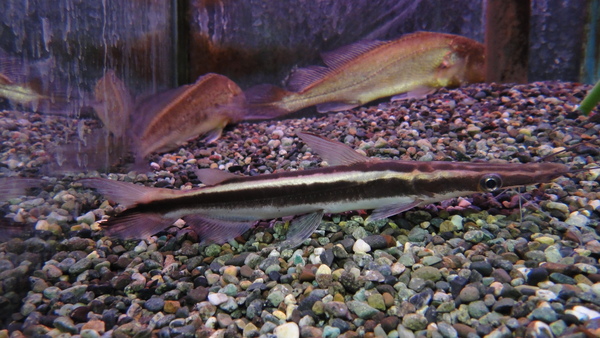 淡水ウツボですが汽水です。細かい金色(というか黄色ですね)のスポットが全身に入ったとっても派手でキレイなウツボです。今は塩分濃度はかなり薄め(かなり適当ですがたぶん0,2~0,3%位だと思います。)で淡水に近い状態でストックできていますが、最終的にはもう少し塩を濃くしてあげたほうがいいのかな??汽水魚好きの方はお見逃しなく!!