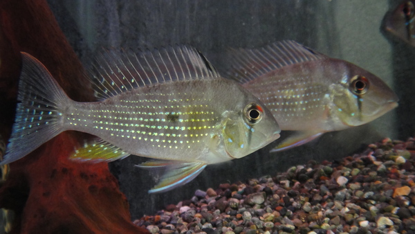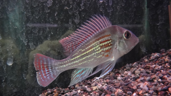 ゲオが好きな方にはヘッケリィもチェックしておいてもらいたいです!ゲオに近縁なシクリッドで、成魚の美しさはハンパじゃないです!メスもキレイですが特にオスは背ビレの先が長く伸び、赤く発色し、めちゃくちゃ派手になります!!右下の画像です。