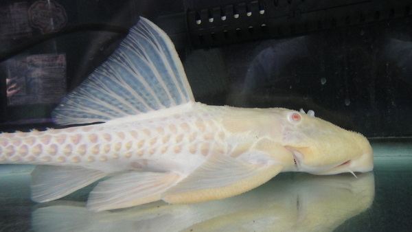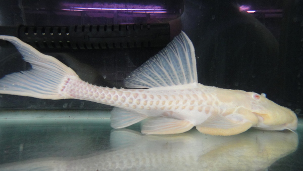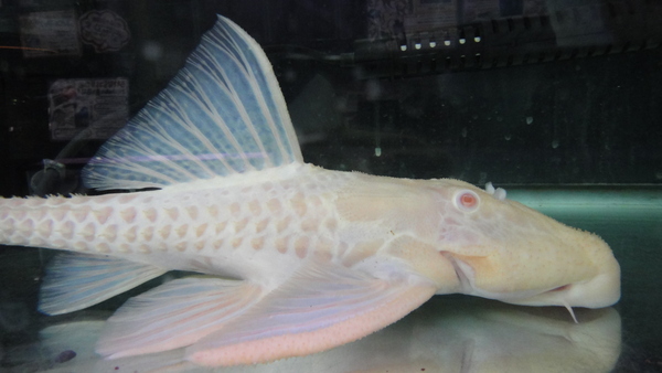 極美!!ビッグサイズのアルビノのアグアプレコが入荷です!以前に比べれば入荷量も増えて見る機会も多くなってきましたが、それは小さいサイズの話。こういうビッグな個体はそうはお目にかかれませんよ!ベビーから飼育した場合、20~25cm位まではけっこう順調に(順調といっても数年はかかりますけどね。)育ってくれる個体も多いですが、特にアルビノの場合はそっからの成長がかなりゆっくりになってしまいます。なのでこういう40近いようなサイズは本当に貴重ですよ!人工飼料もバクバク食べる個体で状態は抜群です!大型魚との混泳にもいいですね!プレコマニアの方だけでなく、アルビノやプラチナマニアの方にもオススメです!こんな立派なアルビノアグアはもう2度と入荷しないかもしれませんよ!