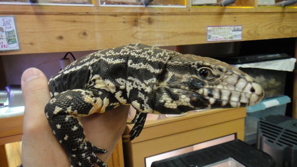 とってもかわいいテグーのベビーが入荷です!頭はかなり白く抜けていますので将来は白勝ちのキレイな個体に育ちそうです!最初は少しバタつくものの、持ってしまえばすぐに大人しくなりますので、ここから育ててあげればベタ馴れになりますよ!お買い上げいただいたお客様には馴らすためのポイントをお教えします!上段の画像です。2つの画像は同一個体です。