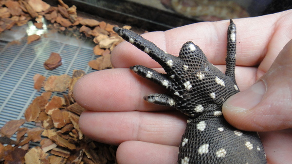 後ろ足の指が1本ありませんので大特価です!指は欠けてますがキズは完全に治っていますので飼育上の問題は全くありません。色は黒勝ちで渋くてかっこいい個体です。サイズはけっこう大きめで全長は60cmを軽く超えていますが、性格がとっても大人しくて超スーパーベタ馴れです!大きくてしかもベタベタに馴れてる個体なので鑑賞だけでなくペットとして飼いたいという方にもオススメです。ほとんどの爬虫類に言えることですが、どんなに馴れていてもその後の扱い方や飼育方法によっては性格がガラっと変わってしまうこともあります。お買い上げいただいたお客様にはベタ慣れ個体の飼育のポイントをお伝えしますのでご安心下さい!中段と左下の画像です。3つの画像は同一個体です。