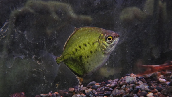 緑色の体色が特徴的なミレウスの1種です。幼魚のうちは特に鮮やかでその体色はかなりのインパクトです!大きくなるにつれて薄れてしまいますが、成魚でも体色は緑がかったシルバーで、ヒレは鮮やかな赤色になりかなりキレイで存在感のある魚のになります!入荷は多くありませんのでメチニスやパクーの好きな方にはとくにオススメですよ!左下の画像です。