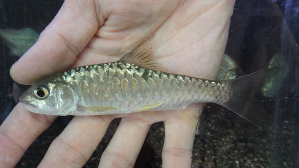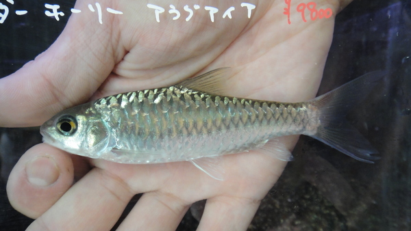 アロワナカープかな?ブルーフィンカープに混じって輸入されたトール属の1種です。淡い金色がかった感じの体色がとってもキレイです!これは1匹だけです。混じり入荷のトールって、なんかマニア心をくすぐりませんか?中段右の画像です。