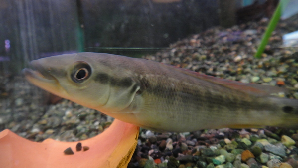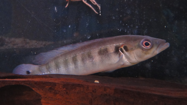 グルピ川の支流トゥリアス川から謎のパイクシクリッドが入荷です!やや短めの詰まった体型で、ころっとした体型がかわいいです!顔は丸味を帯びているようですが下アゴが突き出ているので精悍な印象も受けます。また、目がとても大きいというのもこの魚の特徴だと思います。詳細は不明ですが、体型や顔つきからレティキュラータグループのパイクシクリッドのように感じますがいかがでしょうか?入荷は1匹のみです。かなり変わった魚だと思いますのでマニアの方には特にオススメですよ!右上の画像です。