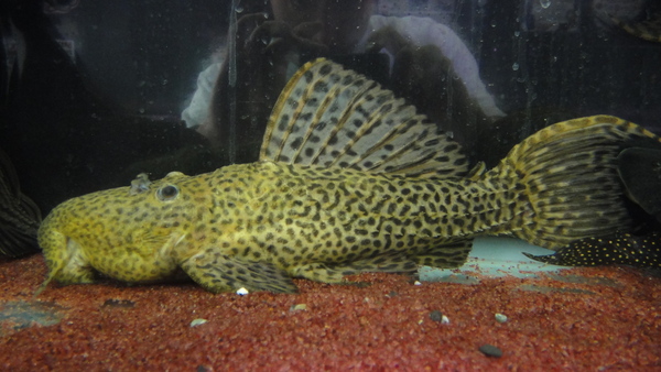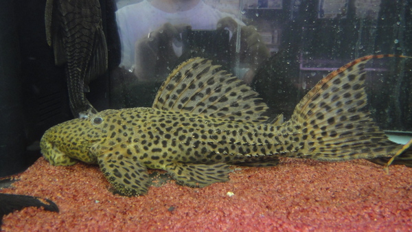 ロライマ産のスーパーオレンジフィンレオパードのお手本みたいなキレイな個体が入荷です!体側には黒くて細かいスポットがびっしりで、ヒレのオレンジは濃く発色しています。一目瞭然、普通のオレンジフィンレオパードとは全然違いますよ!!本物のロライマ産のスーパーオレンジフィンレオパードはとっても高価で入荷もすごく少ないんです!それにこのサイズなら普通はこの値段の倍はしますよ!今回大特価です、はセールにつきさらに大幅値引きです!ウルスカやスカーレットに比べるとちょっと人気が劣ってる感も否めませんが、それらに負けない位に派手でキレイなプレコです!!左上の画像です。