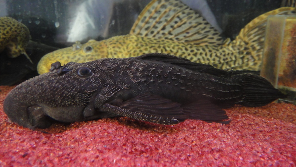 こんな激レアなプレコも来てます!クプープレコみたいに細長い面白いプレコです。全身が黒っぽく見えますがよく見るとスポット模様がびっしりです!さらに画像では分からないと思いますが、頭部には細かくて短い毛のようなトゲが生えているので光があたると銀色にビカビカ光ります!!滅多に輸入されない激レアなプレコですがちょっとマニアックすぎますかね・・・。かなりお買い得なんですけどね・・・。