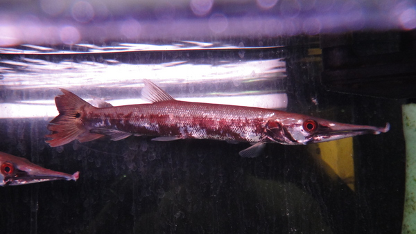 激レアハイドロシナスガーが入荷です!Boulengerella luciusの学名が与えられている種らしいなのですが、とてもややこしいことにこの学名で2種類(2タイプ?)のハイドロシナスガーが輸入されてきます。1つは今回入荷したレオパードハイドロシナスガーで、もう1つがゴールデンハイドロシナスガーと呼ばれるビクーダによく似たハイドロシナスガーです。この学名で輸入されるハイドロシナスガーのほとんどが後者のビクーダもどきの方で、このレオパードは滅多に輸入されません。マニアの間では大きくなると同じになるとか、個体差だとか言われていたようですが、やはり実物を見れば一目瞭然です!レオパードは金色の体にはっきりとしたメタリックブラウンのまだら模様が入ります。それに対してゴールデンの方はまだら模様ではなく太い帯状のラインだったり、個体によってはラインが薄れてスポットの集合になっています。10年位前までは幻の魚だったビクーダが普通に輸入されるようになった今ではこのレオパードハイドロシナスガーがこの仲間の中で一番入荷が少ない魚になっています!滅多に来ない魚ですので中型、大型のカラシンのマニアの方は要チェックです!2匹のみです!中段右の画像です。