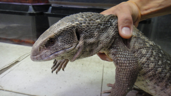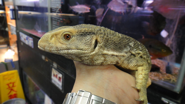 こっちも下取りの飼い込み個体です。後ろ足の爪が1本だけ欠けていますが、体色はパステルチックな薄い色合いでとてもキレイな個体です。こちらもブリブリで状態は良好です!しかもこの個体は超ベタ馴れですよ。良く馴れているし、サイズも頭胴長20cm位の安心サイズですので、大きなトカゲは飼ったことないという方にもオススメできます!中段右と下段の画像です。