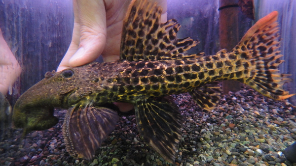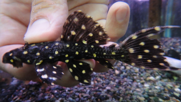 昔は安いプレコだったんですけどね、いつのまにかキンギャラと同じ位の値段になってしまいましたね。ヒレには白いラインが入り、体には大小さまざまなサイズのスポットがびっしりはいったキレイな個体をセレクトしてきました!かなりクオリティに差があるプレコですのでぜひキレイな個体をゲットしてください!