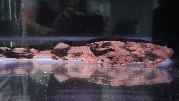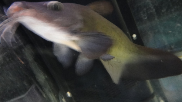 激レアタンダンキャット入荷!!3年位前に初めて輸入されたとても珍しいタンダンで、大きな個体は頭部や各ヒレが真っ黒になり体が金色に発色する超派手な種類です。大型になる種類で、初入荷時は60cm近い個体も輸入されていました。初入荷の時以来入荷していなかったので超久々の入荷です!今回国内には数匹しか輸入されていないらしく、超貴重な魚ですよ!純淡水でも問題なく飼育できる種類で、飼育も全然難しくありません!入荷時、箱から出した時はけっこう黄色っぽかったのですが、水槽に入れたら黒っぽくなってしまいました。落ち着けばまた徐々に金色になると思います。当店への入荷は1匹のみです!次回の入荷は未定ですのでマニアの方はお見逃しなく!!写真を撮ろうとすると泳ぎ回ってしまいキレイな写真がとれませんでした。見難い画像ですいませんが、とりあえず雰囲気は伝わるかと・・・。
