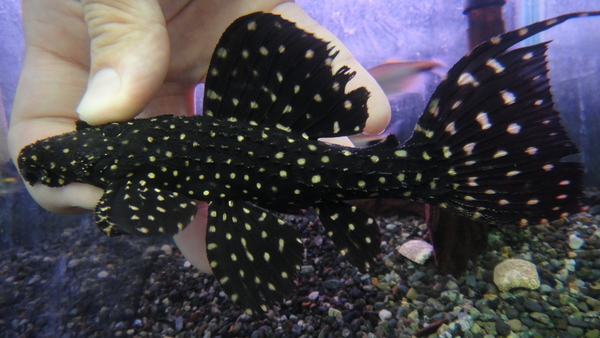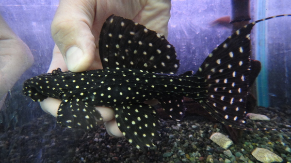 ビカビカの鱗がすごくキレイ!すごく大きくなるまさに男の魚!!普段当店では純淡水でストックしていますが、今回入荷の個体は問屋さんで汽水でストックされていたようなので、とりあえず今は少し塩が入ってる状態です。でも水替えしながら純淡水にならしていくつもりです。この魚意外と純淡水でも普通に飼えちゃいますよ!