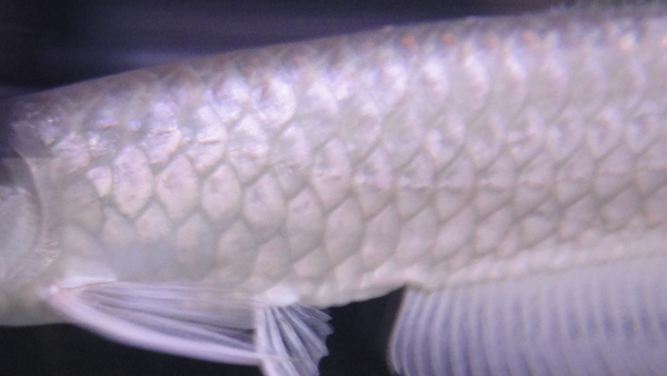 ベビーで入荷してから、もうすぐ4か月がたちますが、順調に大きくなています!見違えるような立派なアロワナになりました!もう既に真っ白ですが、これから成長するにつれてさらに白さが増していきますよ!プラチナブラックにありがちなヒレのバラけや、目垂れ、顎ズレなどの欠点は一切ありません!極上の完品個体です!