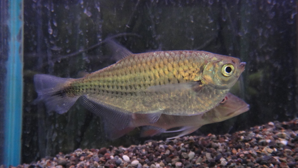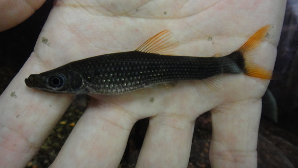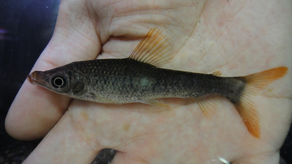 ネグロ産のスリースポットアノストムスです。アノストムス属の中でも本種を含む一部の種類をシューダノス属として分離して分類する場合がありますが、この魚の場合はアノストムスとすることの方が多いと思います。ネグロ産が入荷するのは珍しくあまり見かけない産地だと思います。飼い込むとと体高でてきて背中に入る細いバンド模様も鮮明になってきます!中型カラシンの混泳にいかがですか?中段左の画像です。