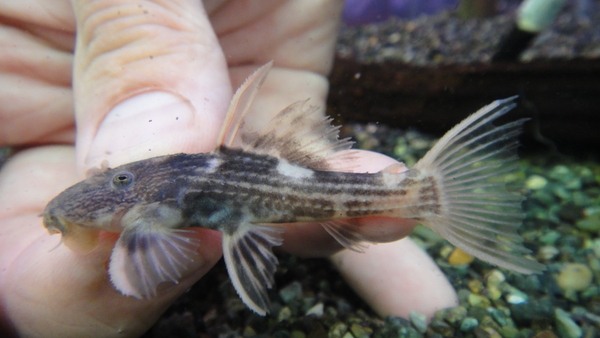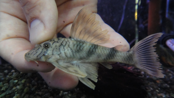 ゴールドラインプラチナゼブラとも呼ばれるキレイなプレコ。濃い茶色のボディにメタリックな淡いゴールドのラインが入ります!飼い込むと尾ビレの上下端がフィラメント状に伸びてきさらに美しくなります!値段も安いのにすごく良いプレコだと思いますよ!