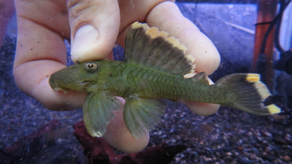 このプレコってキレイですよね!オレンジフィンブラックという名前ですが、実は全然黒くないんです!濃いオリーブグリーンにはっきりした太いオレンジエッジが目立つ極美プレコです!今回大き目で飼い易いサイズで入荷しました!中段右の画像です。