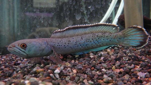 エメラルドスネークヘッドなんて呼ばれることもありますね。ブルームーンより少し遅れて輸入されるようになったインド産の美麗スネークヘッドです。スチュワートにも似ていますが、スチュワートよりも細かいスポットが腹部側にびっしりと入り、背中側のバンドもより細いです。色もメタリックなエメラルドグリーンからメタリックブルーの発色がキレイで、目を惹く魚です。今回はけっこう体色の濃いタイプの個体が入荷しました。こういう色の濃いタイプは発色するとグリーンではなくブルーが強く出ます!ガロの中でも少ないタイプだと思います!マニアの方いかがですか?右上の画像です。
