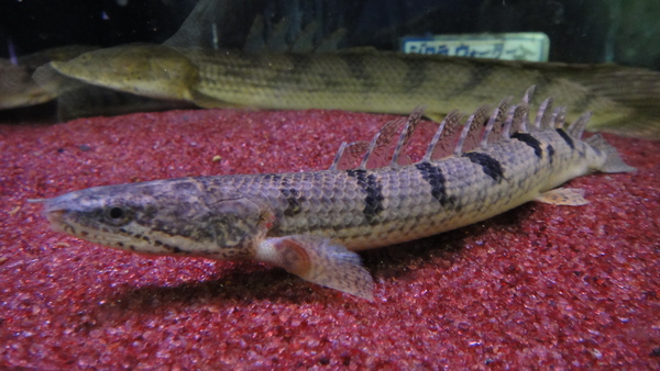 黒い点々模様がはっきり入ったキレイな個体が入荷です!サイズもそこそこあってしっかりした個体です!肺魚の中では大人しく、混泳がうまくいくこともある種です。ただし実際に混泳させる場合は自己責任でお願いします・・・。