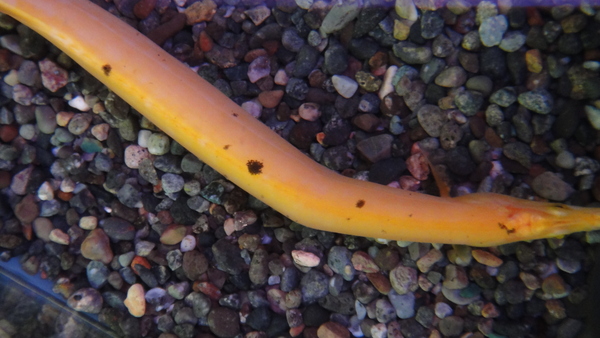 名前にウナギとありますが、ウミヘビの仲間です。見た目はウナギですが胸ビレはありません。ウミヘビの仲間は本来汽水から海水に生息するグループの魚ですが、輸入元からは今回入荷したのは完全な純淡水でも問題無く飼育できる種類のウミヘビだと聞いています。なのでお店でも純淡水でストックしています。にょろにょろ系の好きな方はいかがですか?