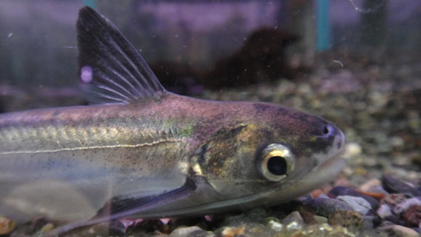 超謎!!こんな魚初めて見ました!!正直ナマズかどうかさえも怪しい雰囲気です。そんな魚なのでインボイスネームも当てになりませんし、属名さえも分かりません・・・。輸入元によると、おそらく日本初入荷と思われ、バングラディッシュの某河川のすごく深い場所にいるらしく、現地の漁師でさえも滅多に見ることのない希少な魚だそうです。バングラデッシュにそんな深い河があるのかは知りませんが、現地のシッパーは水深50m位の所でこの魚の50cm~60cm位のを採ったことがあると言っていたそうです。見た目は名前の通り目がとても大きく、パービャウやワラゴアツーのように横に裂けた大きな口をしています。大きな目と大きな口なんて深海魚みたいなので超深場にいるというのもあながちウソではないかもしれませんね!餌は赤虫とメダカを食べています。今回1匹のみ輸入された貴重な魚です!こういう謎めいた魚に目がない方、ご注文お待ちしております!中段の画像です。10月3日追記・・・知り合いの某国立大学の研究員の方に調べてもらい、ちょっとだけ正体がわかりました。スキルベ科のClupisoma spだそうです。やはりかなり珍しい魚らしく、深場に生息しているため採集例もほとんどないみたいです。