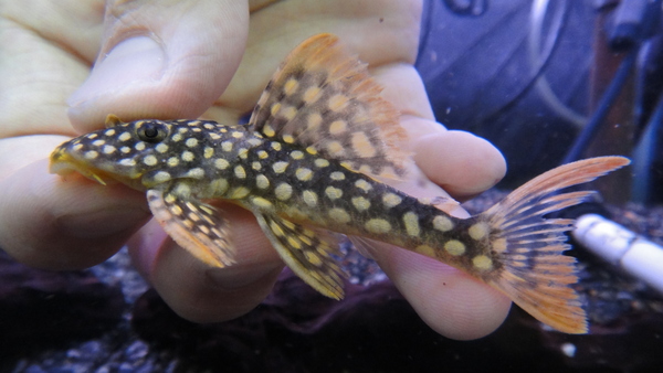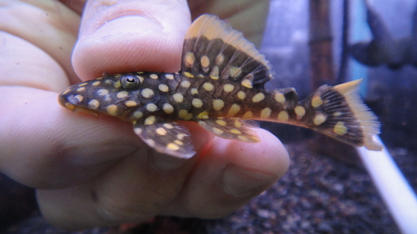 これもキレイで人気あります!黒地に白っぽいクリーム色のスポットが入るプレコです。こいつも安心サイズで入荷してますのでオススメ!
