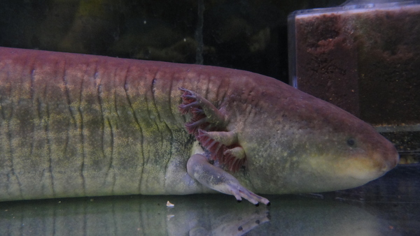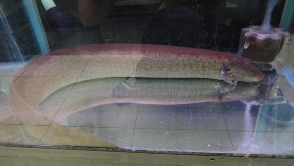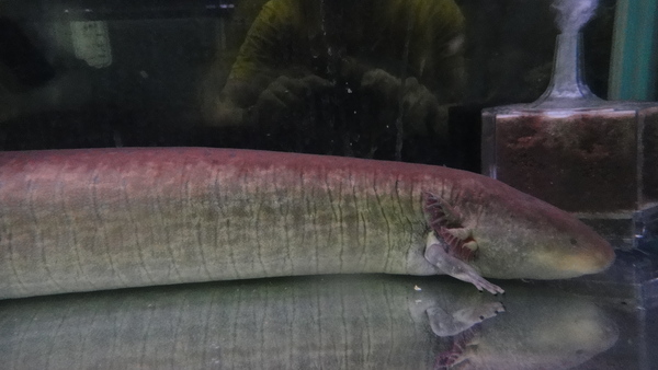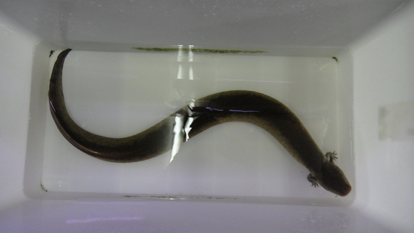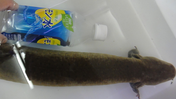 超巨大!こんなの今まで見たことありません!!クネクネしているので正確なサイズはわかりませんが80cm以上はあると思います!画像で写っている水槽は幅60cm奥行45cmのものです。白いケースに入ってる画像で使用しているのは一般的な底面の幅が60cmの衣装ケースで、一緒に写ってるペットボトルは普通の500mlの物です。とにかく物凄い迫力で、画像ではその大きさが伝わらないのが残念です!以前に同じ位の長さのアンフューマが入荷したことがありましたが太さが全然違います!グレーターサイレンはめちゃくちゃ太いです!たぶん私の二の腕位の太さはあると思います。上から見ると500mlのペットボトルと同じ位に見えますが、横から見たら体高は500mlのペットボトルの太さを超えてます!完品でしかもここまで大きいグレーターサイレンは滅多に見られるものではありませんので正直あまり売りたくないのですが・・・。ニョロニョロ系のマニアの方は必見です!