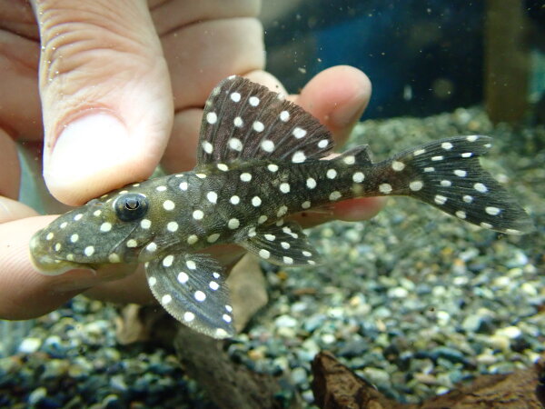 白黒水玉模様のプレコの中ではたぶん1番人気の種類。オレンジフィンカイザーもブラックウィズホワイトカイザーも輸入直後は痩せてるの多いんですけどね、今回は状態良く着いてます!左上の画像です。