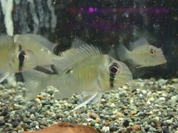 最大で10~12cmほどのかわいいシクリッド。性格も大人しく混泳もさせやすいです。今はまだそんなにキレイではありませんが成熟するととてもキレイになります。ぜひ飼い込んで婚姻色の発色を楽しんでください!左下の画像です。