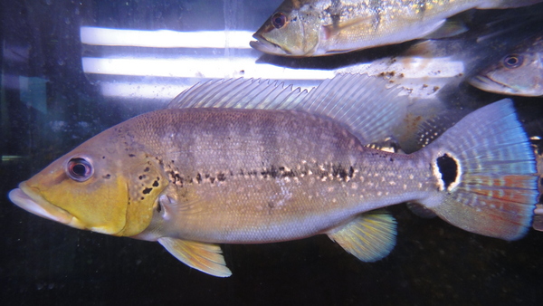 久々の入荷です!そして今回入荷の個体はサイズがいい!まぁ、大きい分値段が高くなってしまいましたが、この値段でも安くしてるつもりなんです・・・。顔まわり、エラ、腹部はキレイなレモン色でヒレは青く染まり、体側は側線に沿うように細かいスポットが並び完璧です!素晴らしいです!左上の画像です。