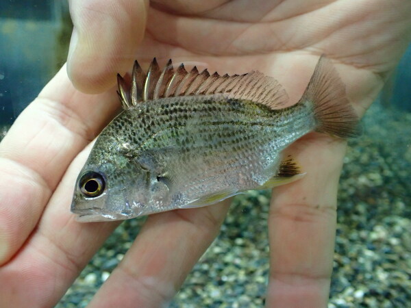 インド洋産のキビレの1種です。インド洋に分布するキビレも日本の沿岸域に分布するキビレも前は同じ種類ということになっていましたが、2013年にインド洋のキビレは3種類が独立して新種記載されています。なので今回入荷したキビレは日本のキビレとは別種です。今回来たのがインド洋に生息する3種類、アラビアンイエローフィンシーブリーム、ウエスタンイローフィンシーブリーム、スポッテッドイエローフィンシーブリームのうちのどれなのかはわかりませんが、日本のキビレとは違う珍しい種類なのは間違いありません。汽水魚マニアの方はお見逃しなく!ちなみに現状では0,3%で塩入れてストックしてます。中段右の画像です。