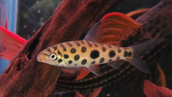 黒地に不明瞭なホワイトスポットが入るちょっと変わった雰囲気のトリムプレコです。よく太った状態の良い個体です。少し尾ビレの先に欠けている部分がありますが、問題なくすぐに再生する程度です。入荷は少ないです。