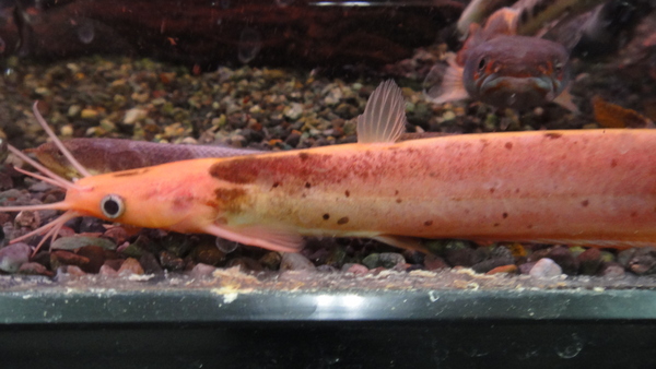 こっちは黒目の黄変個体です。目の色は黒で体色はアルビノのようなオレンジっぽい黄色で、所々に黒いまだら模様が入ります。ナマズの黒目の色変わり個体はその体色を維持する個体もいますが、稀に飼育中に元の普通体色に戻ってしまう個体もいます。現状はノーマル個体とは全く違うとても美しい体色ですが、この個体が今後もこのままなのかは分かりませんので悪しからず・・・。でもこのまだら模様が消えてもっとキレイになる可能性もありますから面白いとおもいますよ!それにこの値段ですから、戻ってもそんなに損をするようなことはないと思いますけどね?!