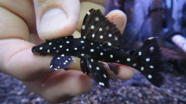 真っ黒ボディに真っ白スポットの人気プレコです!ゴツゴツした感じの体型もかっこいいです!