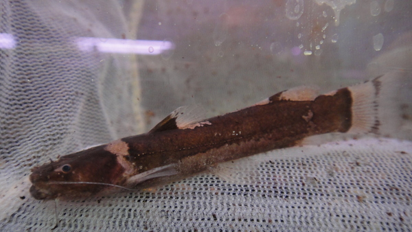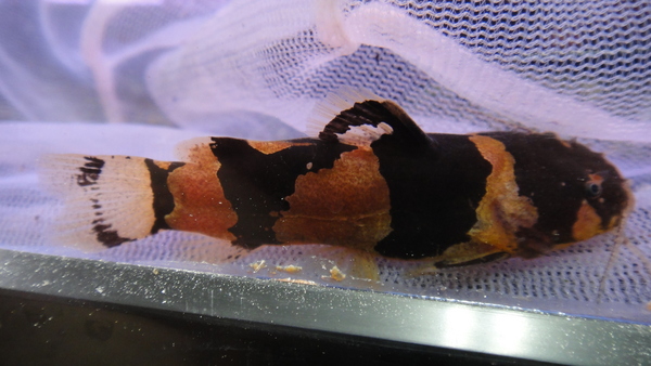 超激レアの小型ナマズが入荷です!こんなナマズ初めて見ました!スレンダーなロングボディで、頭は扁平です。バンブルビーキャットと同属のナマズだと思われますが模様も独特で、バンド状にはならず、背部にストライプ状の模様が入ります。輸入元の話では初入荷とのことです。このてのナマズはなかなか狙って同じものを仕入れるのが難しいので、次回の入荷がいつになるのかはわかりません!いる時が買い時ですよ!マニアの方には超オススメです!といってもこういう魚のマニアの方ってそんなにはいないんんだろうなぁ・・・。下段の画像です。2つの画像は同一個体です。